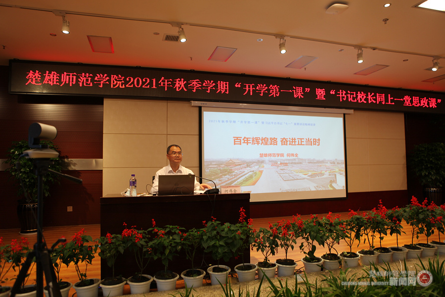 学校党委书记何伟全为全体2021级新生讲授题为“百年辉煌路 奋进正当时”的开学第一课。何伟全书记从一个“宣告”、32字的“伟大建党精神”、86次提“人民”、九个“必须”、三个“和”、三个“不变”、三个“绝不”、一个“号召”、三个“不负”、四个“伟大成就”、三个“一切”、两个“万岁”十二个方面对习近平总书记“七一”重要讲话精神的深刻内涵进行了全面剖析;解读了习近平总书记“七一”重要讲话精神的重大意义;最后,鼓励大家涵养“三气”,勇担大任,积极响应习近平总书记对中国青年的号召“新时代的中国青年要以实现中华民族伟大复兴为己任,增强做中国人的志气、骨气、底气,不负时代,不负韶华,不负党和人民的殷切希望,在祖国的万里长空放飞青春梦想。”