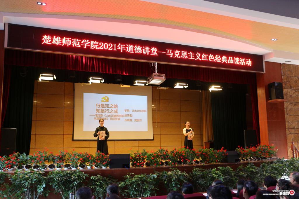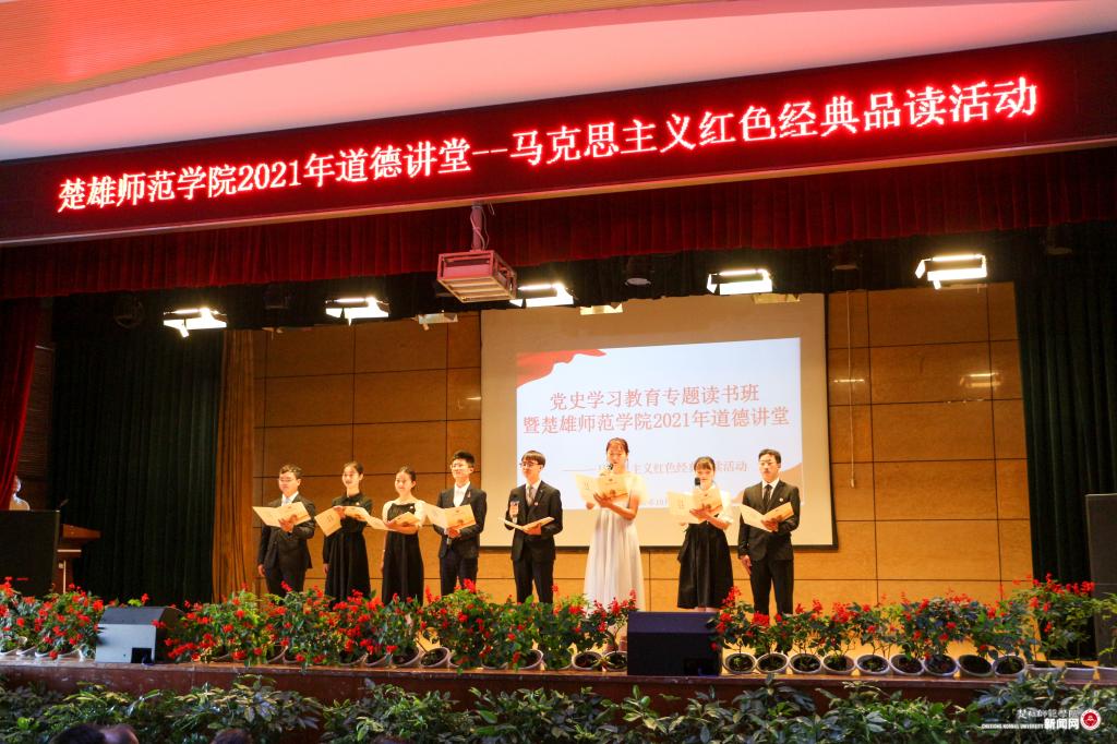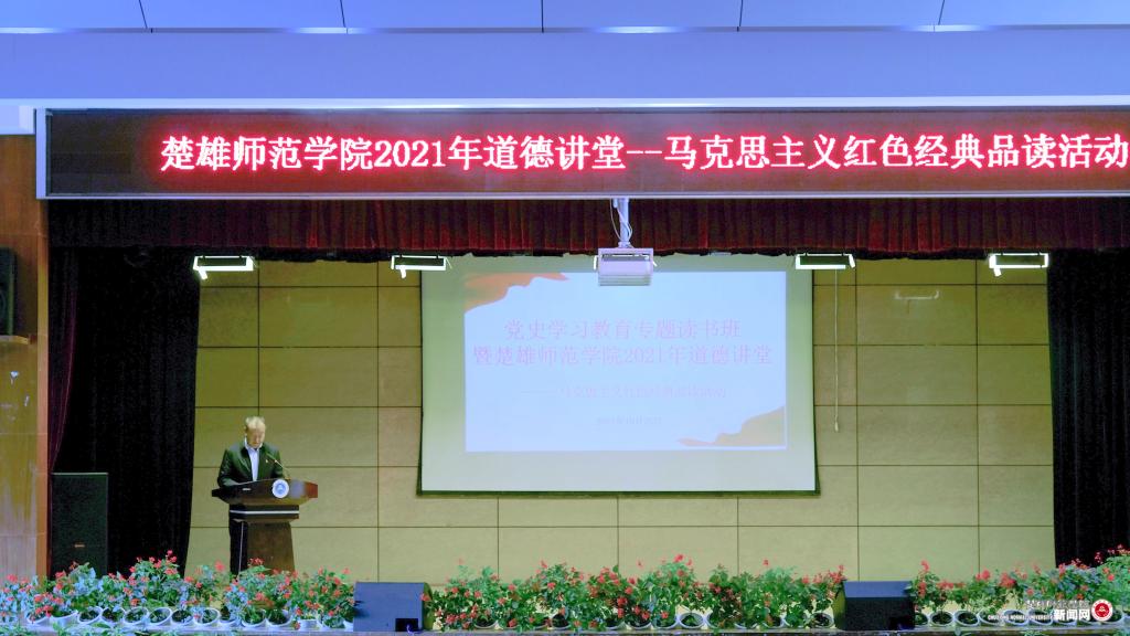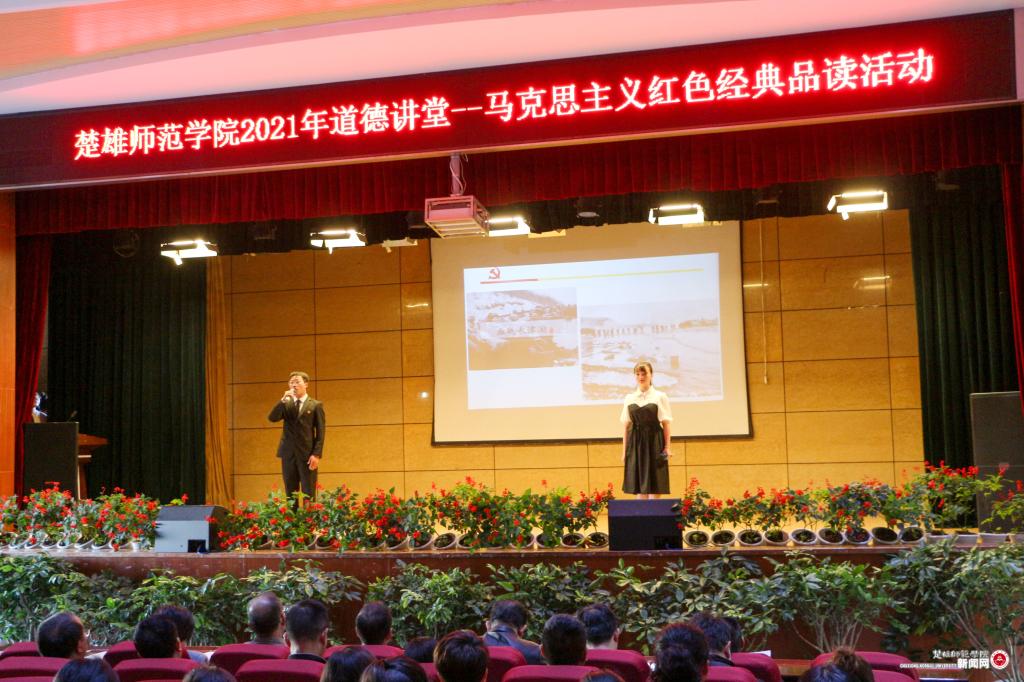 为深入学习贯彻习近平总书记在党史学习教育动员大会上的重要讲话,进一步贯彻落实好习近平总书记“多读、精读一些马克思主义经典作家的著作,多读、精读一些马克思主义中国化的经典篇章”的重要指示批示精神,按照学校党史学习教育总体安排和工作部署,以学校文明创建“道德讲堂”活动为载体,10月25日下午,“党史学习教育专题读书班暨楚雄师范学院2021年道德讲堂——马克思主义红色经典品读”活动在雁塔校区上礼堂举行。