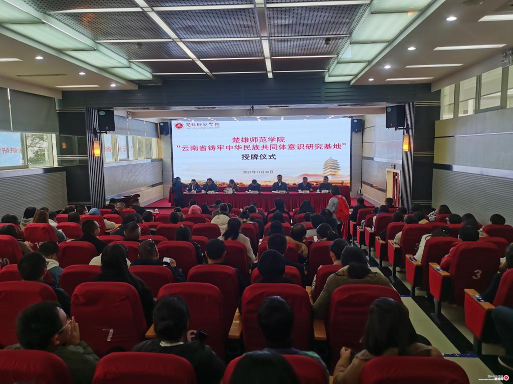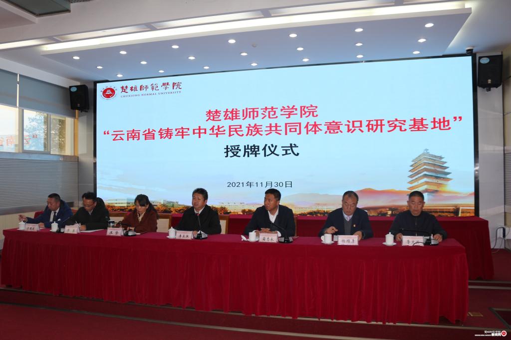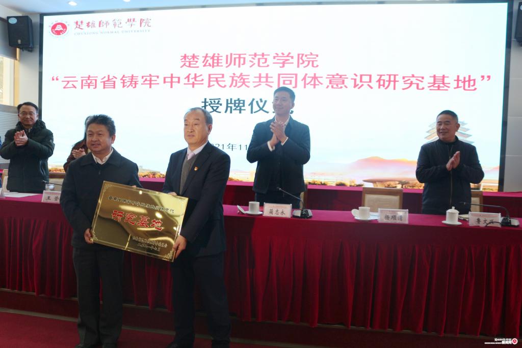 云南省民族宗教事务委员会党组成员、副主任李正洪出席仪式并为基地授牌,学校党委副书记、基地负责人杨顺清接牌。楚雄州委常委、州人民政府副州长蔺志永宣读了云南省民宗委《关于公布云南省铸牢中华民族共同体意识研究基地名单的通知》。