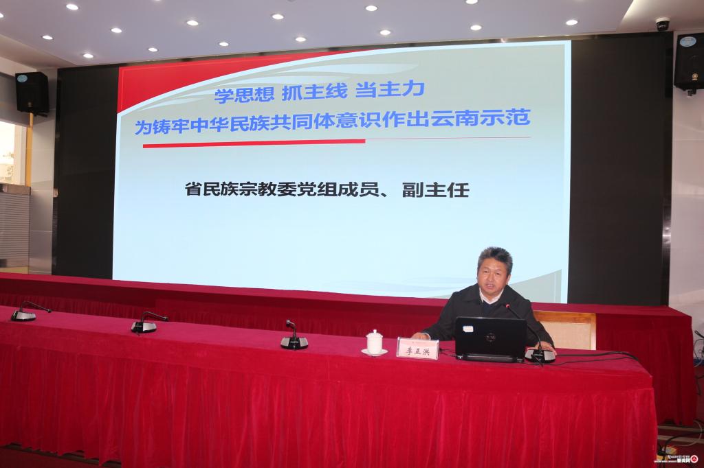授牌仪式后,学校举行学习宣传贯彻中央民族工作会议精神专题报告会。云南省民族宗教事务委员会党组成员、副主任李正洪作题为“学思想抓主线当主力——为铸牢中华民族共同体意识作出云南示范”的报告。李正洪在报告中指出,楚雄师范学院要以习近平新时代中国特色社会主义思想为指导,以铸牢中华民族共同体意识为主线,以服务云南建设成为我国民族团结进步示范区提供理论支撑为目标,充分发挥学校在民族理论研究方面独特的学科优势和资源优势。