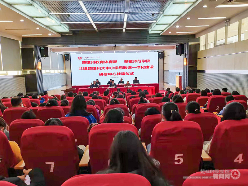 为深入学习贯彻习近平总书记在学校思政课教师座谈会上重要讲话精神,进一步推进落实学校与州委宣传部签署的共建马克思主义学院协议,为楚雄州深化大中小学思政课建设和推进内涵式发展积极服务,经与楚雄州教育体育局共同研究,12月8日下午,楚雄州教育体育局、楚雄师范学院共建大中小学思政课一体化建设研修中心挂牌仪式在我校信息中心第一报告厅举行。中共楚雄州委教育工委书记、楚雄州教育体育局党组书记、局长段福君,中共楚雄州委宣传部理论政策法规科科长杨征祥,州委党校机关党委副书记张发润,州社科联社科研究所所长曹显光,楚雄州教育体育科学研究所所长自洪明,副所长杨修昌出席挂牌仪式;学校党委副书记、校长王资,党委副书记杨顺清,党委委员、宣传部部长刁国庆,各职能部门负责人,各二级党组织书记,马克思主义学院全体教师及学生代表参加挂牌仪式。仪式由杨顺清主持。