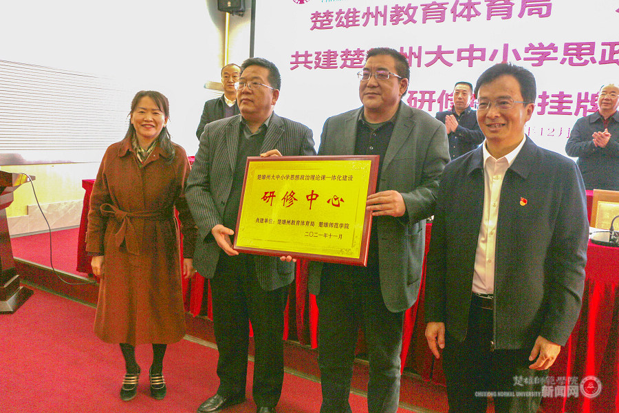 中共楚雄州委教育工委书记、楚雄州教育体育局党组书记、局长段福君,楚雄师范学院党委副书记、校长王资共同颁授“楚雄州大中小学思想政治理论课一体化建设研修中心”牌匾,由楚雄州教育体育科学研究所所长自洪明、楚雄师范学院马克思主义学院院长徐光辉共同接牌。