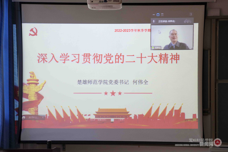 为认真做好党的二十大精神学习宣传贯彻工作,按照党中央统一部署和省委、省委教育工委工作要求,根据《中共云南省委教育工委 云南省教育厅关于印发云南省教育系统学习宣传贯彻党的二十大精神工作方案的通知》安排,结合疫情防控工作要求,学校采取线上与线下相结合的方式有序组织开展党的二十大精神宣讲工作。11月30日,学校开展书记校长“同讲一堂思政课”,党委书记何伟全在线上为部分师生宣讲了党的二十大精神。
